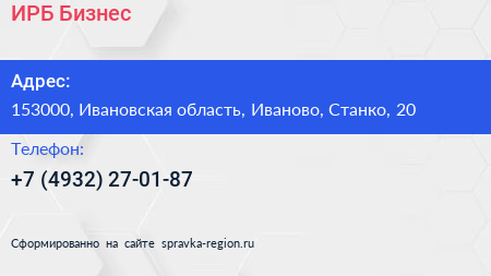ИРБ-Бизнес по адресу 153000, Ивановская область, Иваново, Станко, 20 в дальнейшем Организация, размещена в следующих категориях:
