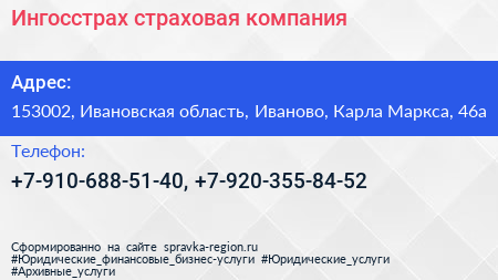 Ингосстрах, страховая компания по адресу 153002, Ивановская область, Иваново, Карла Маркса, 46а в дальнейшем Организация, размещена в следующих категориях: