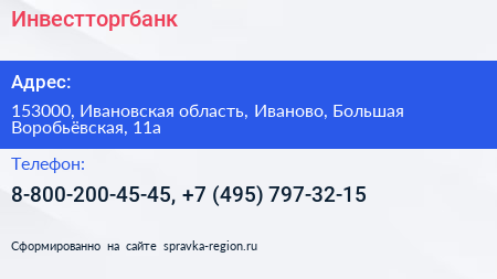 Инвестторгбанк по адресу 153000, Ивановская область, Иваново, Большая Воробьёвская, 11а в дальнейшем Организация, размещена в следующих категориях: