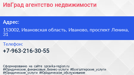 ИвГрад, агентство недвижимости по адресу 153002, Ивановская область, Иваново, проспект Ленина, 31 в дальнейшем Организация, размещена в следующих категориях: