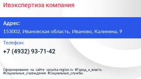 Ивэкспертиза, компания по адресу 153002, Ивановская область, Иваново, Калинина, 9 в дальнейшем Организация, размещена в следующих категориях: