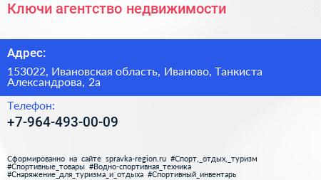 Ключи, агентство недвижимости по адресу 153022, Ивановская область, Иваново, Танкиста Александрова, 2а в дальнейшем Организация, размещена в следующих категориях: