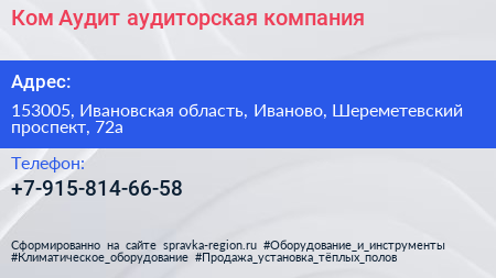Ком-Аудит, аудиторская компания по адресу 153005, Ивановская область, Иваново, Шереметевский проспект, 72а в дальнейшем Организация, размещена в следующих категориях: