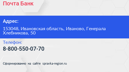 Почта Банк по адресу 153048, Ивановская область, Иваново, Генерала Хлебникова, 50 в дальнейшем Организация, размещена в следующих категориях: