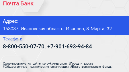 Почта Банк по адресу 153037, Ивановская область, Иваново, 8 Марта, 32 в дальнейшем Организация, размещена в следующих категориях: