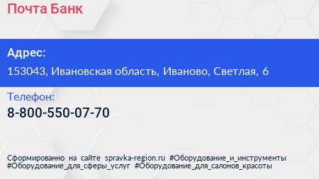 Почта Банк по адресу 153043, Ивановская область, Иваново, Светлая, 6 в дальнейшем Организация, размещена в следующих категориях: