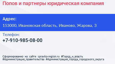 Попов и партнеры, юридическая компания по адресу 153000, Ивановская область, Иваново, Жарова, 3 в дальнейшем Организация, размещена в следующих категориях: