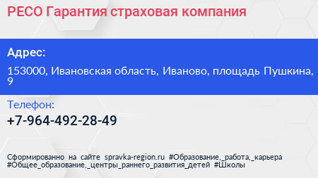 РЕСО-Гарантия, страховая компания по адресу 153000, Ивановская область, Иваново, площадь Пушкина, 9 в дальнейшем Организация, размещена в следующих категориях: