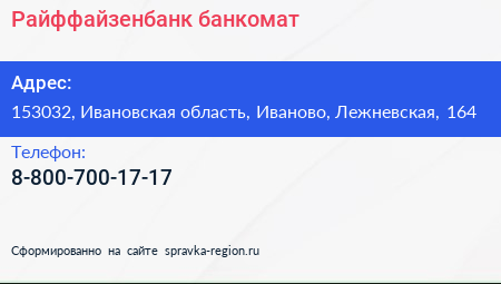 Райффайзенбанк, банкомат по адресу 153032, Ивановская область, Иваново, Лежневская, 164 в дальнейшем Организация, размещена в следующих категориях: