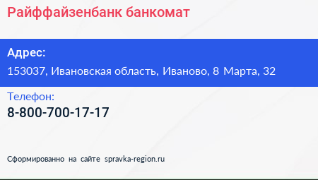 Райффайзенбанк, банкомат по адресу 153037, Ивановская область, Иваново, 8 Марта, 32 в дальнейшем Организация, размещена в следующих категориях:
