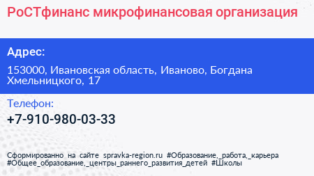 РоСТфинанс, микрофинансовая организация по адресу 153000, Ивановская область, Иваново, Богдана Хмельницкого, 17 в дальнейшем Организация, размещена в следующих категориях: