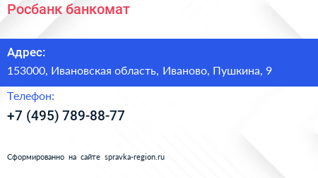 Росбанк, банкомат по адресу 153000, Ивановская область, Иваново, Пушкина, 9 в дальнейшем Организация, размещена в следующих категориях: