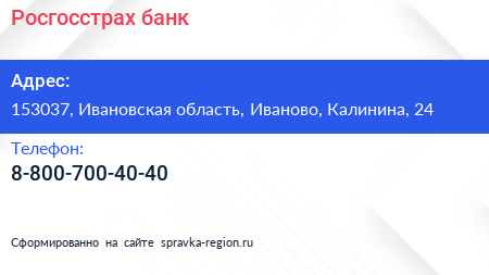 Росгосстрах банк по адресу 153037, Ивановская область, Иваново, Калинина, 24 в дальнейшем Организация, размещена в следующих категориях: