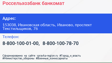 Россельхозбанк, банкомат по адресу 153038, Ивановская область, Иваново, проспект Текстильщиков, 76 в дальнейшем Организация, размещена в следующих категориях: