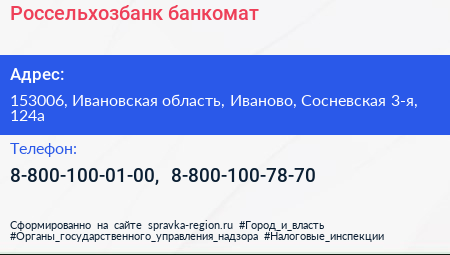 Россельхозбанк, банкомат по адресу 153006, Ивановская область, Иваново, Сосневская 3-я, 124а в дальнейшем Организация, размещена в следующих категориях: