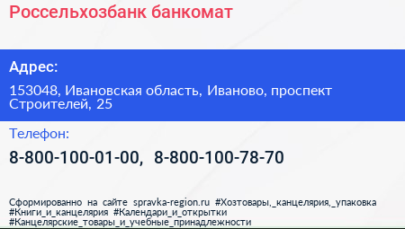 Россельхозбанк, банкомат по адресу 153048, Ивановская область, Иваново, проспект Строителей, 25 в дальнейшем Организация, размещена в следующих категориях: