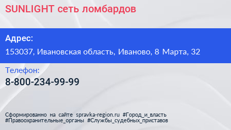SUNLIGHT, сеть ломбардов по адресу 153037, Ивановская область, Иваново, 8 Марта, 32 в дальнейшем Организация, размещена в следующих категориях: