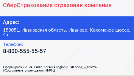 СберСтрахование, страховая компания по адресу 153051, Ивановская область, Иваново, Кохомское шоссе, 4а в дальнейшем Организация, размещена в следующих категориях: