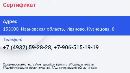 Сертификат+ по адресу 153000, Ивановская область, Иваново, Кузнецова, 8 в дальнейшем Организация, размещена в следующих категориях: