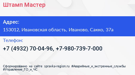 Штамп Мастер по адресу 153012, Ивановская область, Иваново, Сакко, 37а в дальнейшем Организация, размещена в следующих категориях: