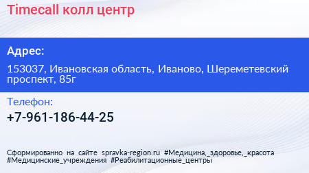 Тimecall, колл-центр по адресу 153037, Ивановская область, Иваново, Шереметевский проспект, 85г в дальнейшем Организация, размещена в следующих категориях: