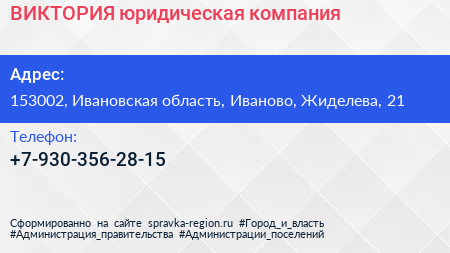 ВИКТОРИЯ, юридическая компания по адресу 153002, Ивановская область, Иваново, Жиделева, 21 в дальнейшем Организация, размещена в следующих категориях: