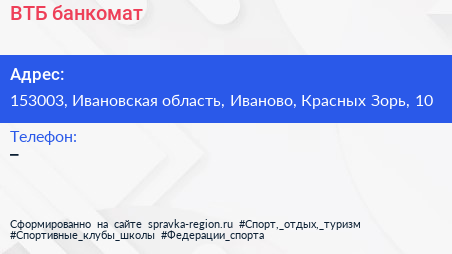 ВТБ, банкомат по адресу 153003, Ивановская область, Иваново, Красных Зорь, 10 в дальнейшем Организация, размещена в следующих категориях: