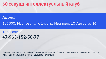 60 секунд, интеллектуальный клуб по адресу 153000, Ивановская область, Иваново, 10 Августа, 16 в дальнейшем Организация, размещена в следующих категориях:
