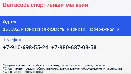 Barracuda, спортивный магазин по адресу 153002, Ивановская область, Иваново, Набережная, 9 в дальнейшем Организация, размещена в следующих категориях: