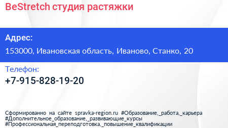 BeStretch, студия растяжки по адресу 153000, Ивановская область, Иваново, Станко, 20 в дальнейшем Организация, размещена в следующих категориях: