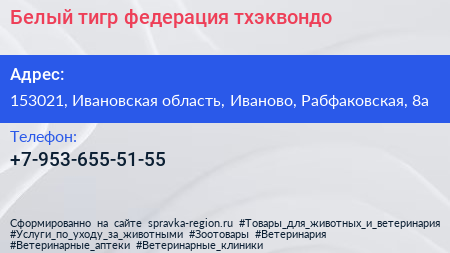 Белый тигр, федерация тхэквондо по адресу 153021, Ивановская область, Иваново, Рабфаковская, 8а в дальнейшем Организация, размещена в следующих категориях: