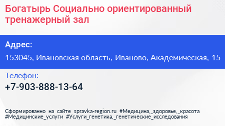 Богатырь, Социально-ориентированный тренажерный зал по адресу 153045, Ивановская область, Иваново, Академическая, 15 в дальнейшем Организация, размещена в следующих категориях:
