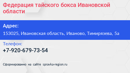 Федерация тайского бокса Ивановской области по адресу 153025, Ивановская область, Иваново, Тимирязева, 5а в дальнейшем Организация, размещена в следующих категориях: