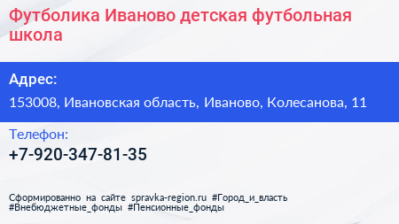 Футболика Иваново, детская футбольная школа по адресу 153008, Ивановская область, Иваново, Колесанова, 11 в дальнейшем Организация, размещена в следующих категориях: