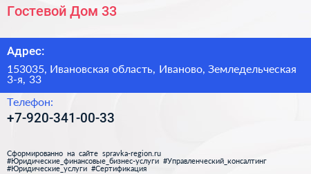 Гостевой Дом 33 по адресу 153035, Ивановская область, Иваново, Земледельческая 3-я, 33 в дальнейшем Организация, размещена в следующих категориях: