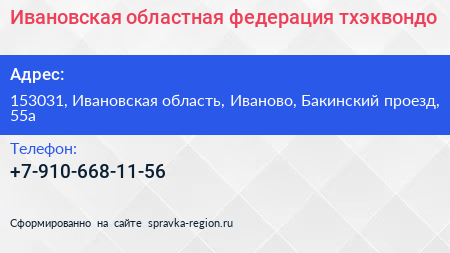 Ивановская областная федерация тхэквондо по адресу 153031, Ивановская область, Иваново, Бакинский проезд, 55а в дальнейшем Организация, размещена в следующих категориях: