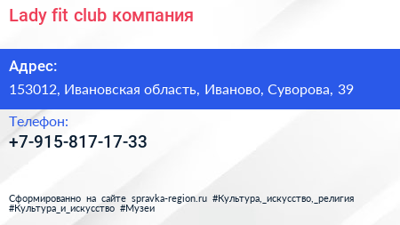 Lady fit club, компания по адресу 153012, Ивановская область, Иваново, Суворова, 39 в дальнейшем Организация, размещена в следующих категориях:
