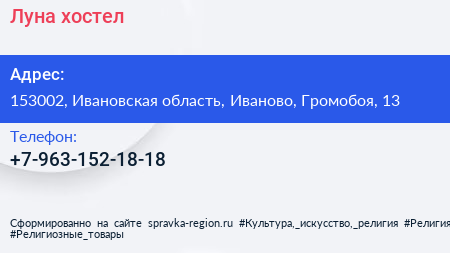 Луна, хостел по адресу 153002, Ивановская область, Иваново, Громобоя, 13 в дальнейшем Организация, размещена в следующих категориях: