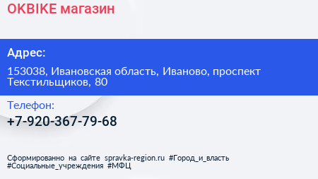 OKBIKE!, магазин по адресу 153038, Ивановская область, Иваново, проспект Текстильщиков, 80 в дальнейшем Организация, размещена в следующих категориях: