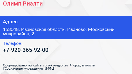 Олимп-Риэлти по адресу 153048, Ивановская область, Иваново, Московский микрорайон, 2 в дальнейшем Организация, размещена в следующих категориях: