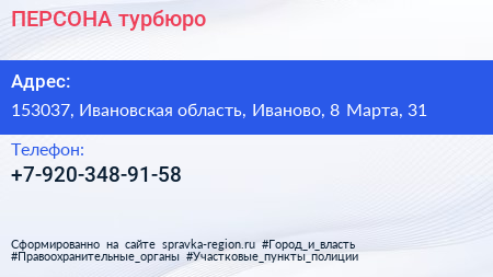 ПЕРСОНА, турбюро по адресу 153037, Ивановская область, Иваново, 8 Марта, 31 в дальнейшем Организация, размещена в следующих категориях: