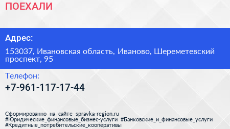 ПОЕХАЛИ! по адресу 153037, Ивановская область, Иваново, Шереметевский проспект, 95 в дальнейшем Организация, размещена в следующих категориях: