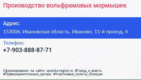 Производство вольфрамовых мормышек по адресу 153006, Ивановская область, Иваново, 11-й проезд, 4 в дальнейшем Организация, размещена в следующих категориях: