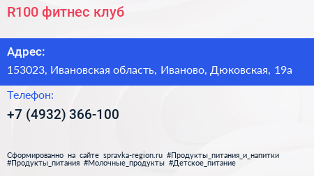 R100, фитнес-клуб по адресу 153023, Ивановская область, Иваново, Дюковская, 19а в дальнейшем Организация, размещена в следующих категориях: