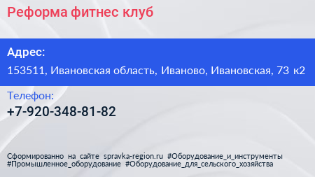 Реформа, фитнес-клуб по адресу 153511, Ивановская область, Иваново, Ивановская, 73 к2 в дальнейшем Организация, размещена в следующих категориях: