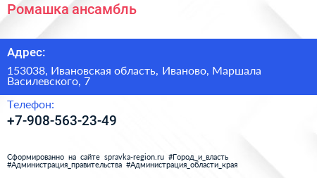Ромашка, ансамбль по адресу 153038, Ивановская область, Иваново, Маршала Василевского, 7 в дальнейшем Организация, размещена в следующих категориях: