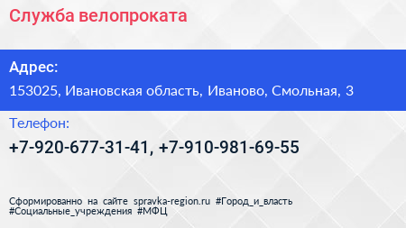 Служба велопроката по адресу 153025, Ивановская область, Иваново, Смольная, 3 в дальнейшем Организация, размещена в следующих категориях: