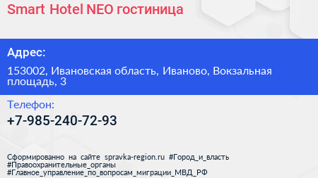Smart Hotel NEO, гостиница по адресу 153002, Ивановская область, Иваново, Вокзальная площадь, 3 в дальнейшем Организация, размещена в следующих категориях:
