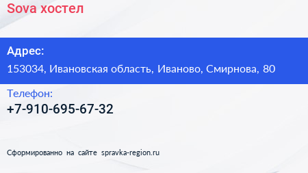 Sova, хостел по адресу 153034, Ивановская область, Иваново, Смирнова, 80 в дальнейшем Организация, размещена в следующих категориях: