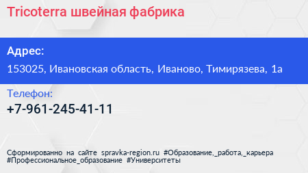 Tricoterra, швейная фабрика по адресу 153025, Ивановская область, Иваново, Тимирязева, 1а в дальнейшем Организация, размещена в следующих категориях: